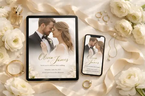 Crisp Cycladic whites, deep Aegean blue, and warm sunset hues transport your guests to Santorini's cliffside chapels. A design that captures the magic of Greek island weddings — effortless Mediterranean elegance with the golden glow of Oia at sunset.